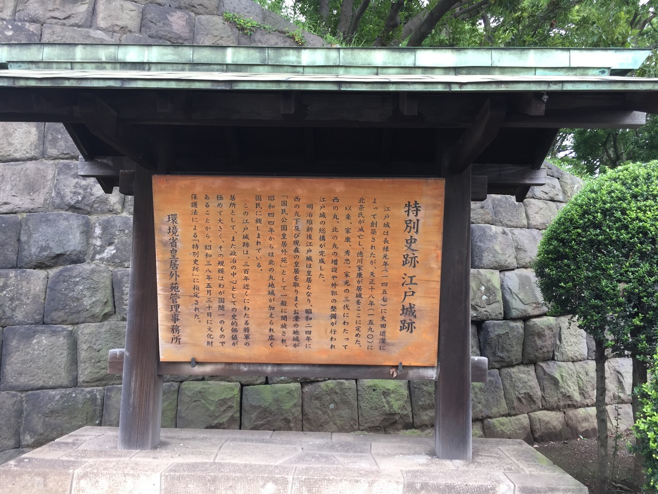 皇居を含む広大な江戸城跡です。あちこちに江戸城跡を示す屋根のついた木製の看板が立てられています。江戸は地震や火災が多く、また第二次世界大戦の空襲のため、ほとんど江戸城の姿は失くなったようですが、天守閣から今の東京を見たかったです。