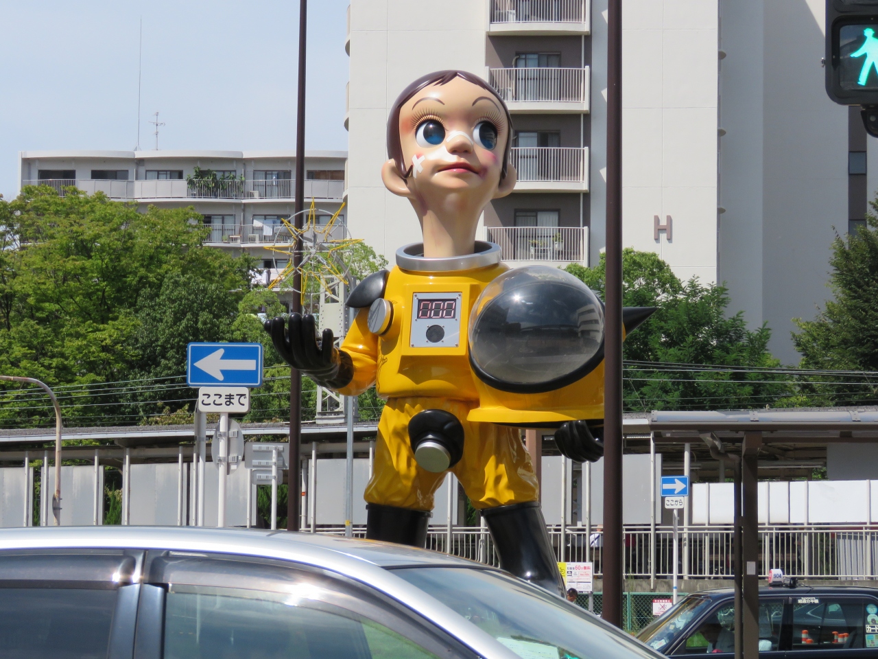 手に「輝く太陽」を持ち、弟分にサン・チャイルド(大阪・阪急南茨木駅前に設置)がいます。