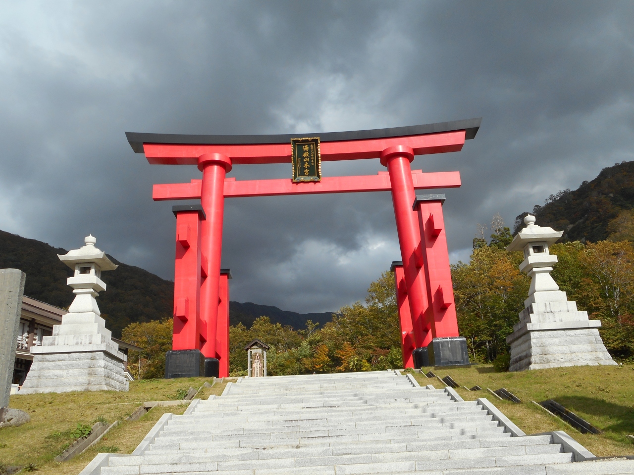 月山道路を降り、さらに有料道路を10分ほど進んだ場所に大きな赤鳥居が現れてきます。