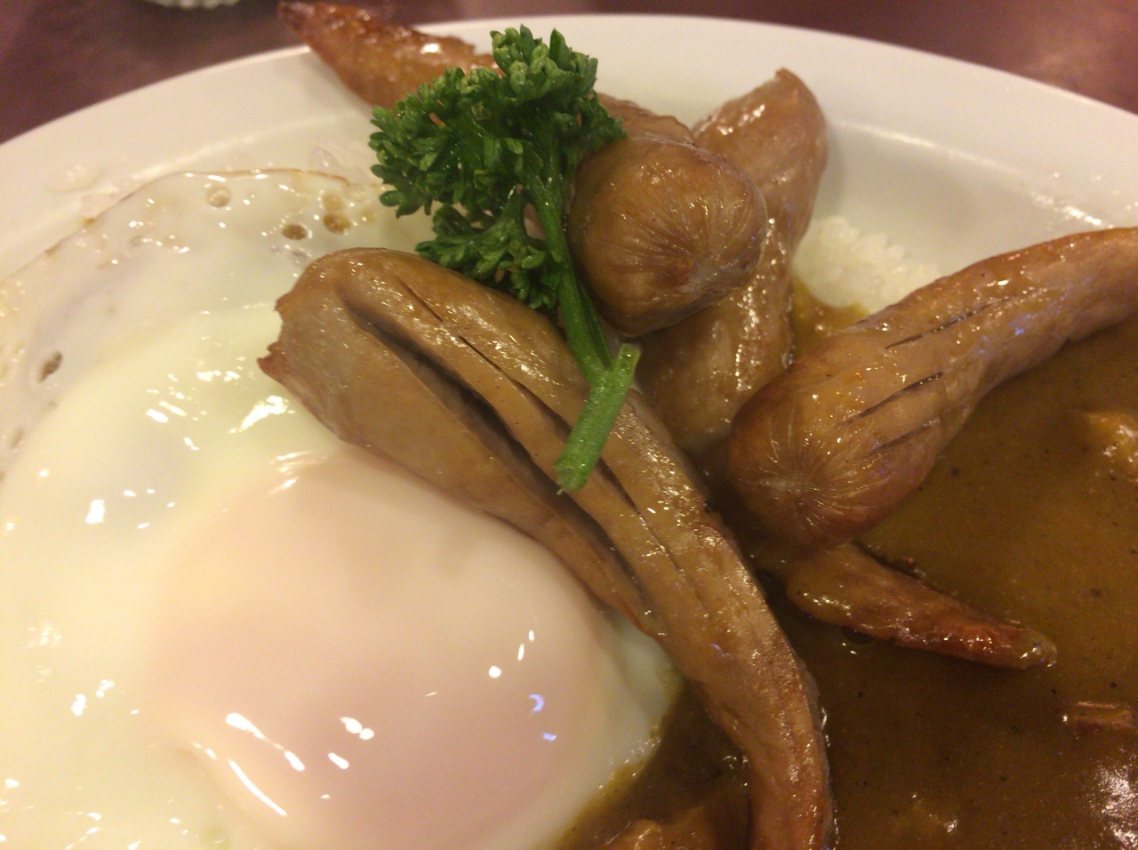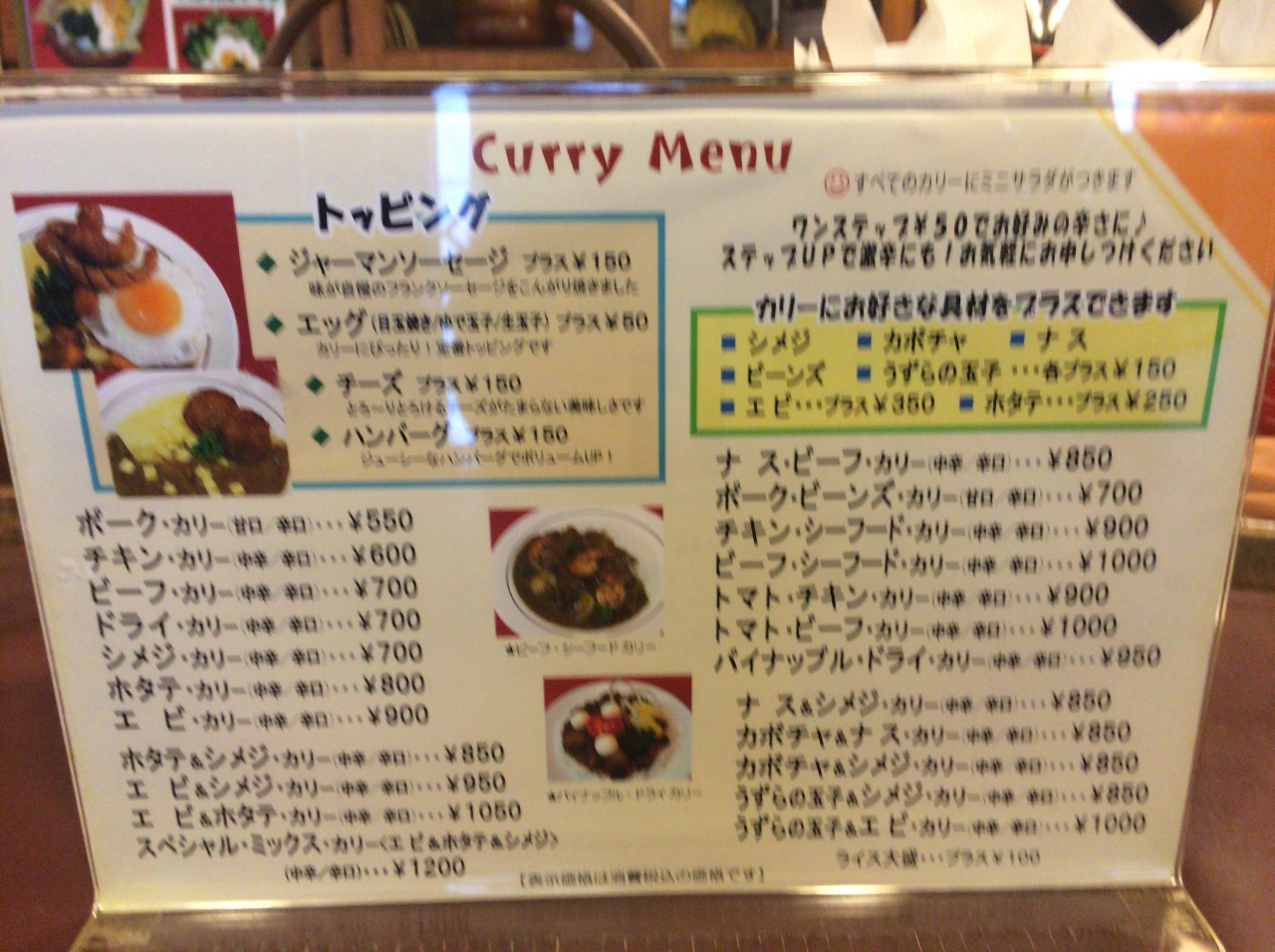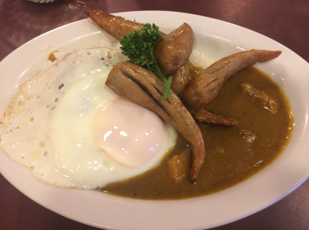 色々なメニューからポークカレーにジャーマンソーセージ150円と玉子焼50円をトッピング、良心的な価格だ