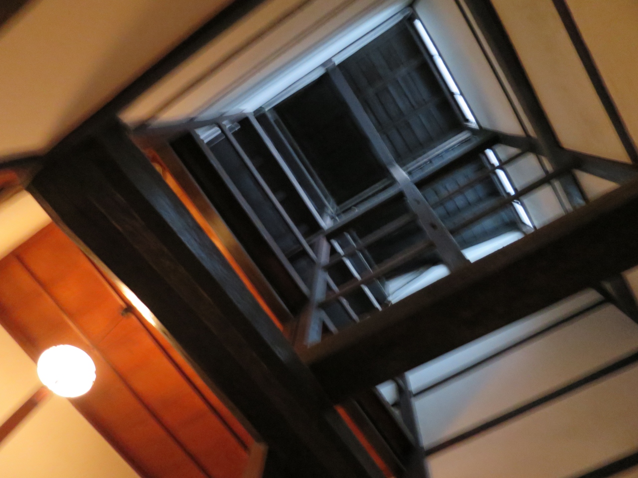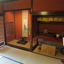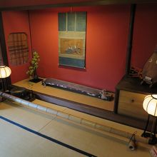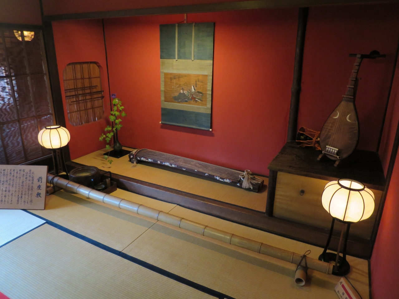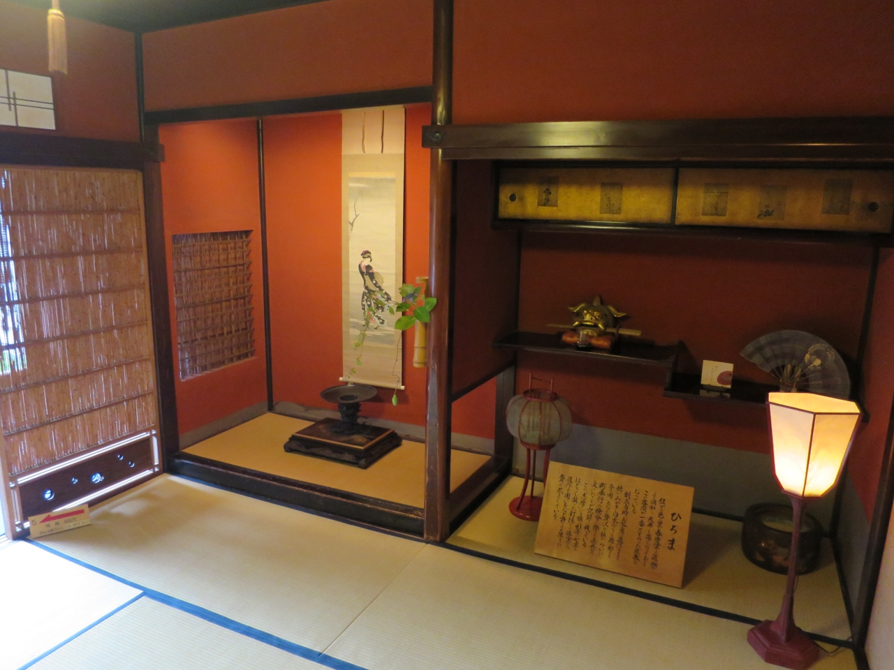 入ると先ず2階の客間座敷に上がります。簾のある戸、朱色の壁や、芸事に使われた三味線などが置かれ、情緒があります。そのあと一階に下り台所、中庭、帳場が見学できます。