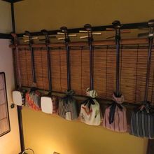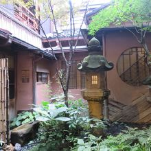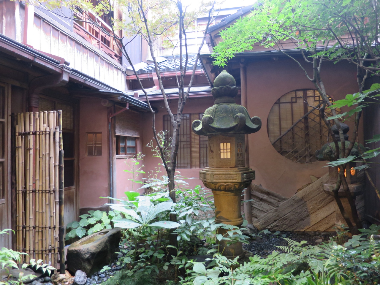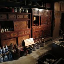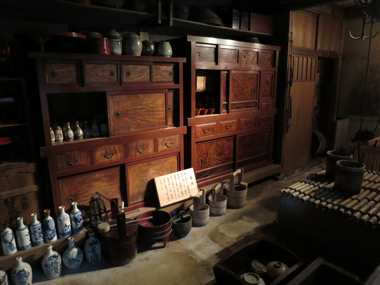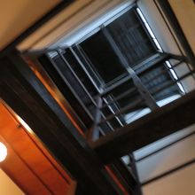 入ると先ず2階の客間座敷に上がります。簾のある戸、朱色の壁や、芸事に使われた三味線などが置かれ、情緒があります。そのあと一階に下り台所、中庭、帳場が見学できます。