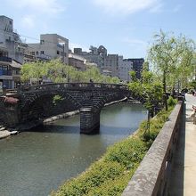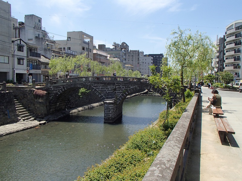 長崎の有名観光スポットの眼鏡橋の周りの公園なんですけども眼鏡橋のほかにも普通の形の石橋がいっぱいかかっていて橋の名前を書いた案内板がありましたよ。アイスクリンを売っているおばちゃんもいたりして長崎っぽい名所でしたよ。