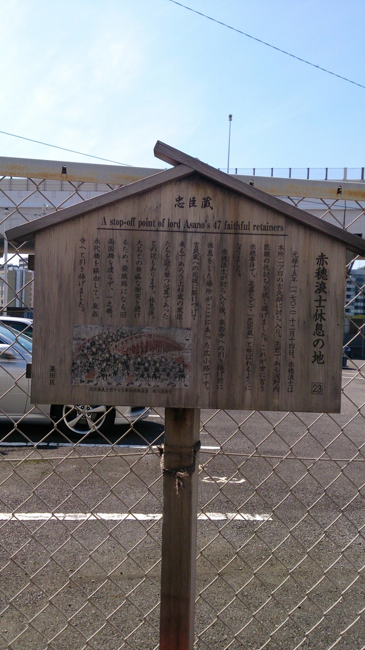 隅田川に架かる両国橋の墨田区側の橋のたもとから、50mぐらい下流側に行った場所に高札がたっています。この高札以外は目印になるものは全くなく、周辺はマンションや中小企業の工場や事務所ビルなどが建っており、ひっそりとしています。江戸時代の超有名な出来事である、忠臣蔵において、両国はゆかりの地とのことで様々なスポットがありますが、その中ではかなり質素なスポットです。忠臣蔵ゆかりの地を散策する際に立ち寄る時間があれば訪れる感じの場所です。