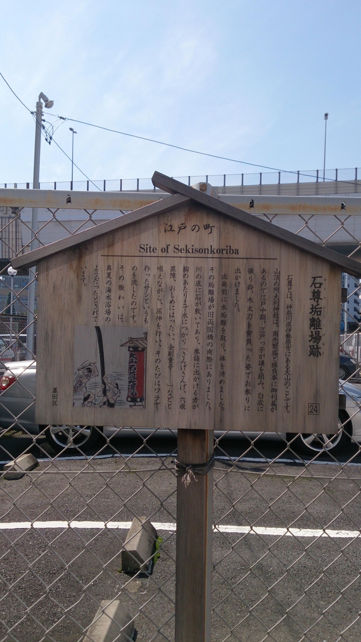 両国周辺を散策した際に立ち寄りました。高札スタイルの観光案内看板が設置されており、江戸時代の大山詣での参拝に出発する前にこの地で体を清めたとのことで、そのお清めの仕方まであって、その混雑ぶりも夏場の海水浴場なみだったらしく、大山詣でが江戸の庶民に浸透していたことがすごく良くわかりました。今はこの高札しか残っておらず、メインの京葉道路から少し入った場所なのでひっそりとしております。両国橋の墨田区側のたもとからすぐの場所なのでわかりやすいです。
