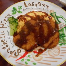 ボルガライスはオムライスに、カツが乗り、ソースがかけられたもので、想像通りの味でおいしくないわけがないのですが、ここは小ぶりのカツを2枚丁寧に盛りつけたようなスタイルで、口当たりが軽くペロッと食べきってしまうことができました、