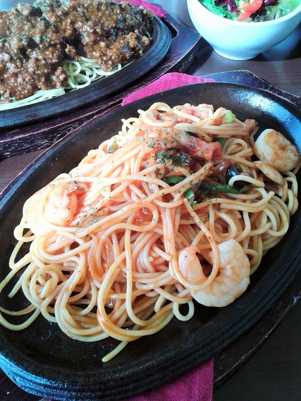 カツの乗ったミートソースとエビの入ったパスタを食べました。