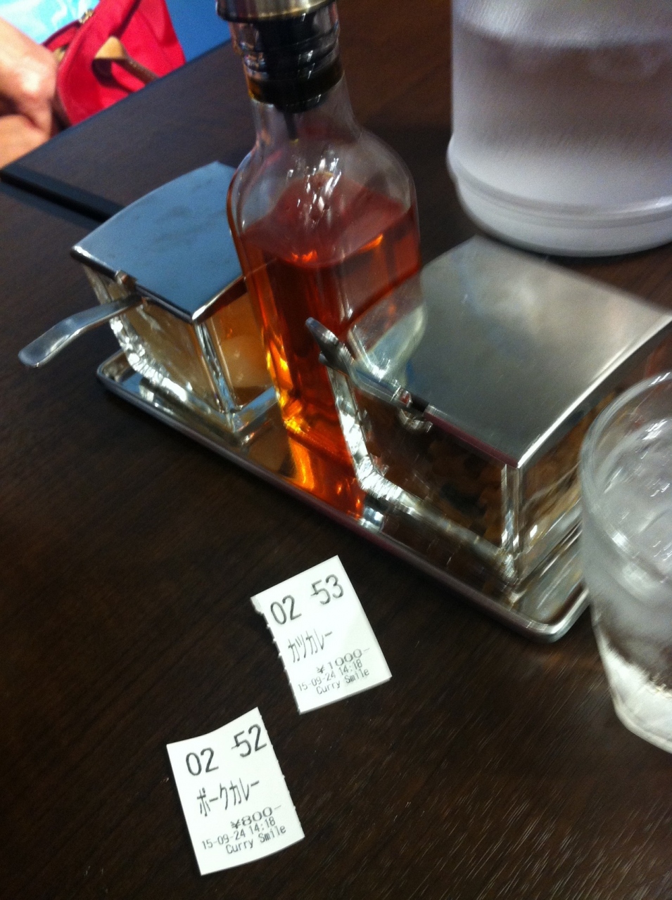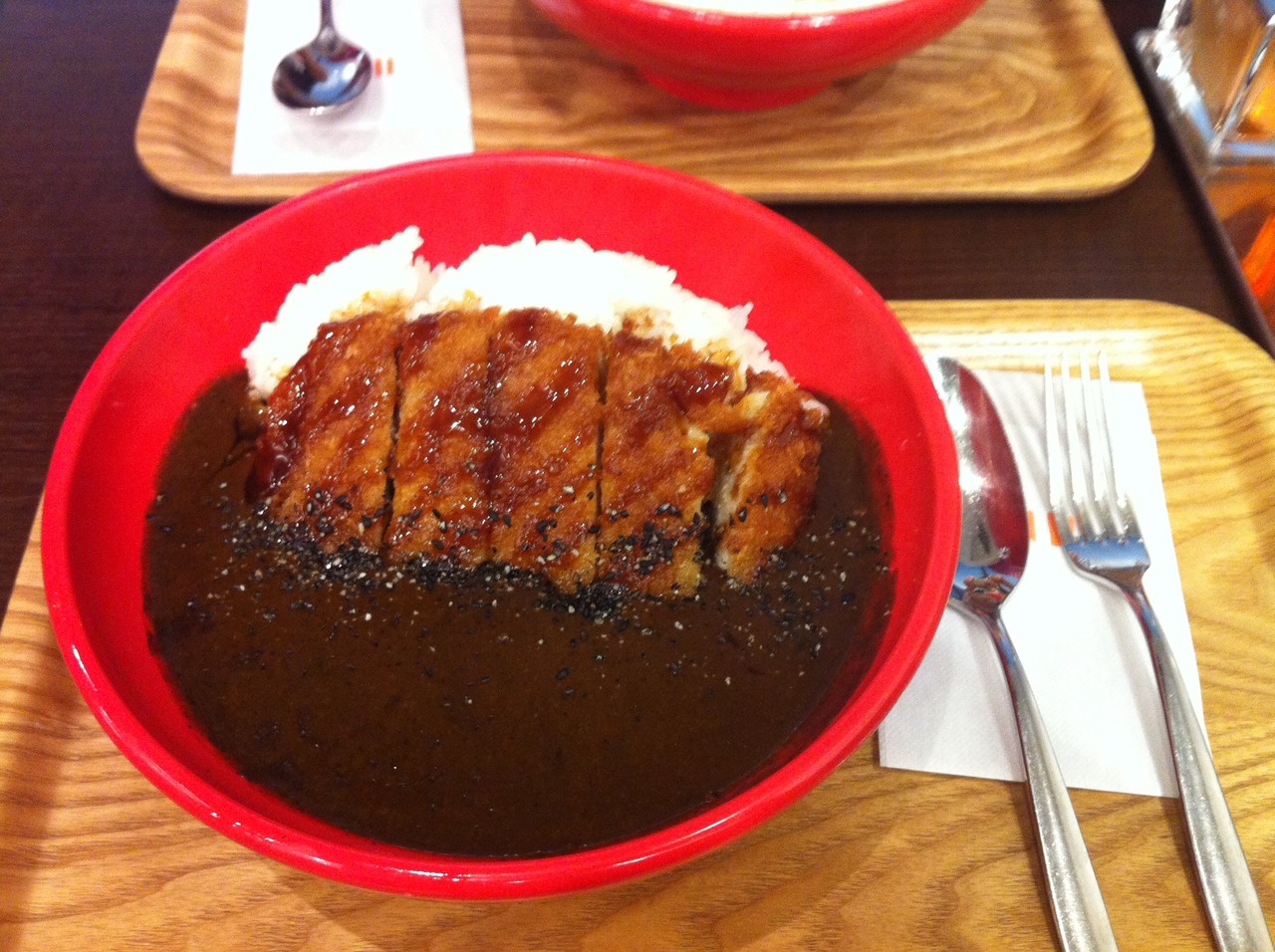 端にテーブル席もありますが、カウンター席がずらりと並んでいます。事前に食券を購入するシステムです。なので、写真で大きく店頭に表示されているメニューを選びますよね。私は「三元豚の黒ゴマカツカレー」1000円を選びました。羽田に到着してパッと腹ごしらえするには良いお店かと思います。