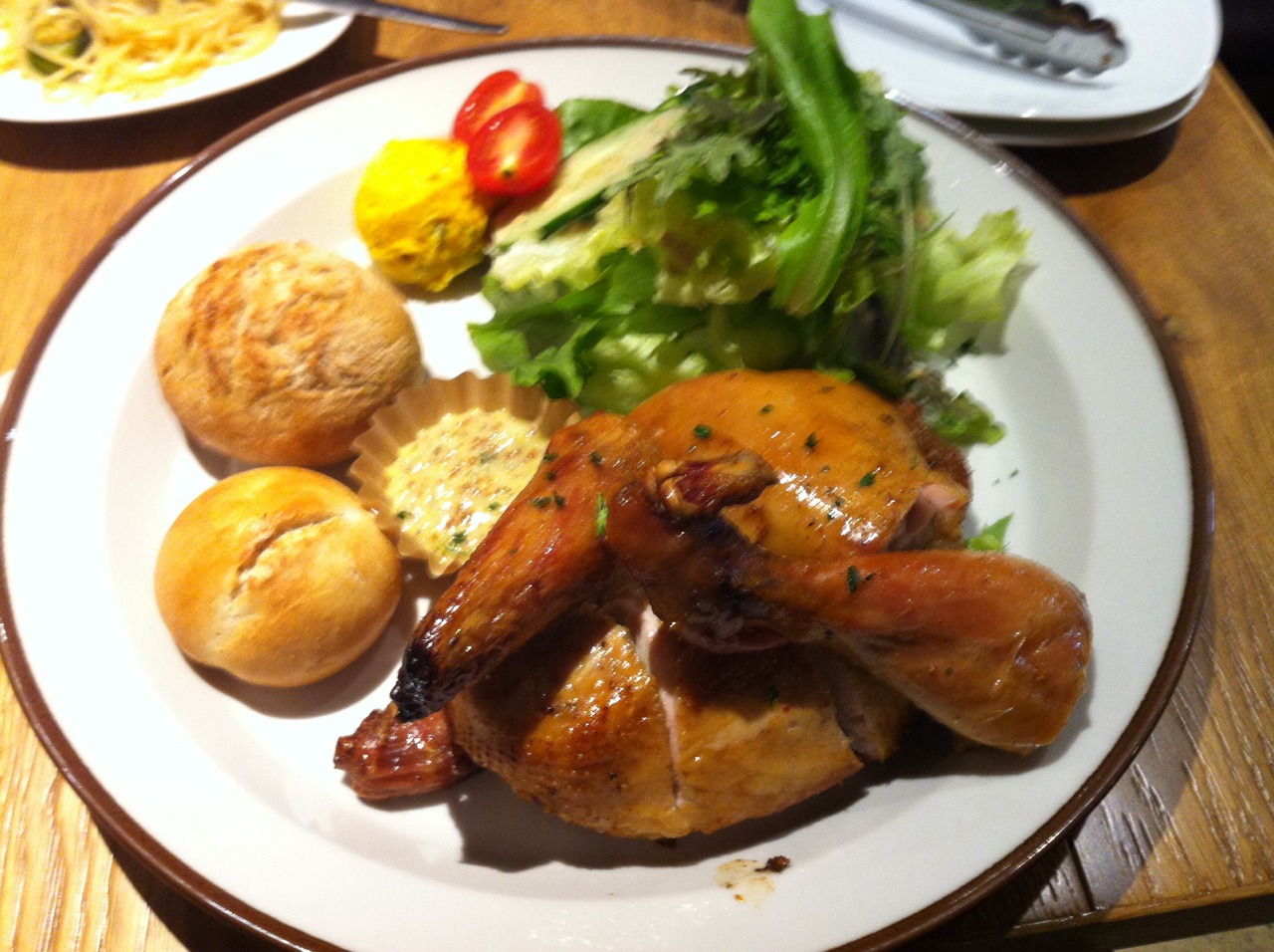 ローストチキン1/2のランチセット1880円、パスタランチ1380円をオーダーしました。いずれもドリンク、サラダ付き。チキンにはパンも付きます。