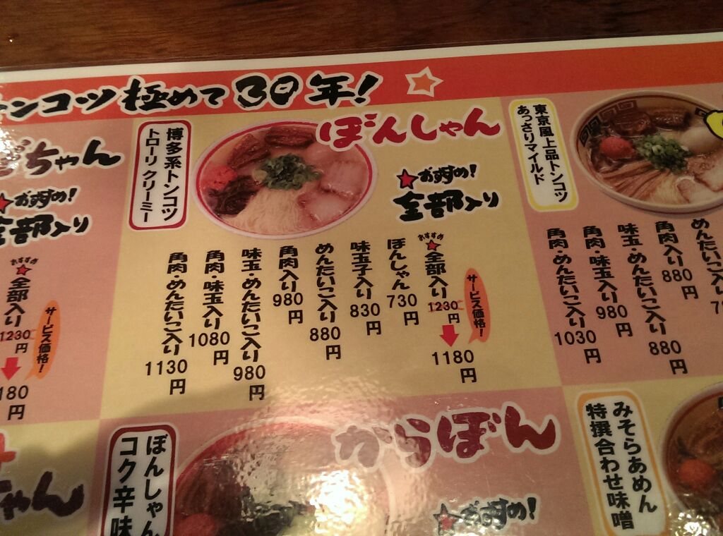 メニューは、東京とんこつの「九州じゃんがら」、博多げんこつの「ぼんしゃん」、熊本マー油の「こぼんしゃん」、合わせ味噌の「じゃんがらみそ」、辛味の「からぼん」に各トッピング違い、ご飯物やドリンクも用意されています。