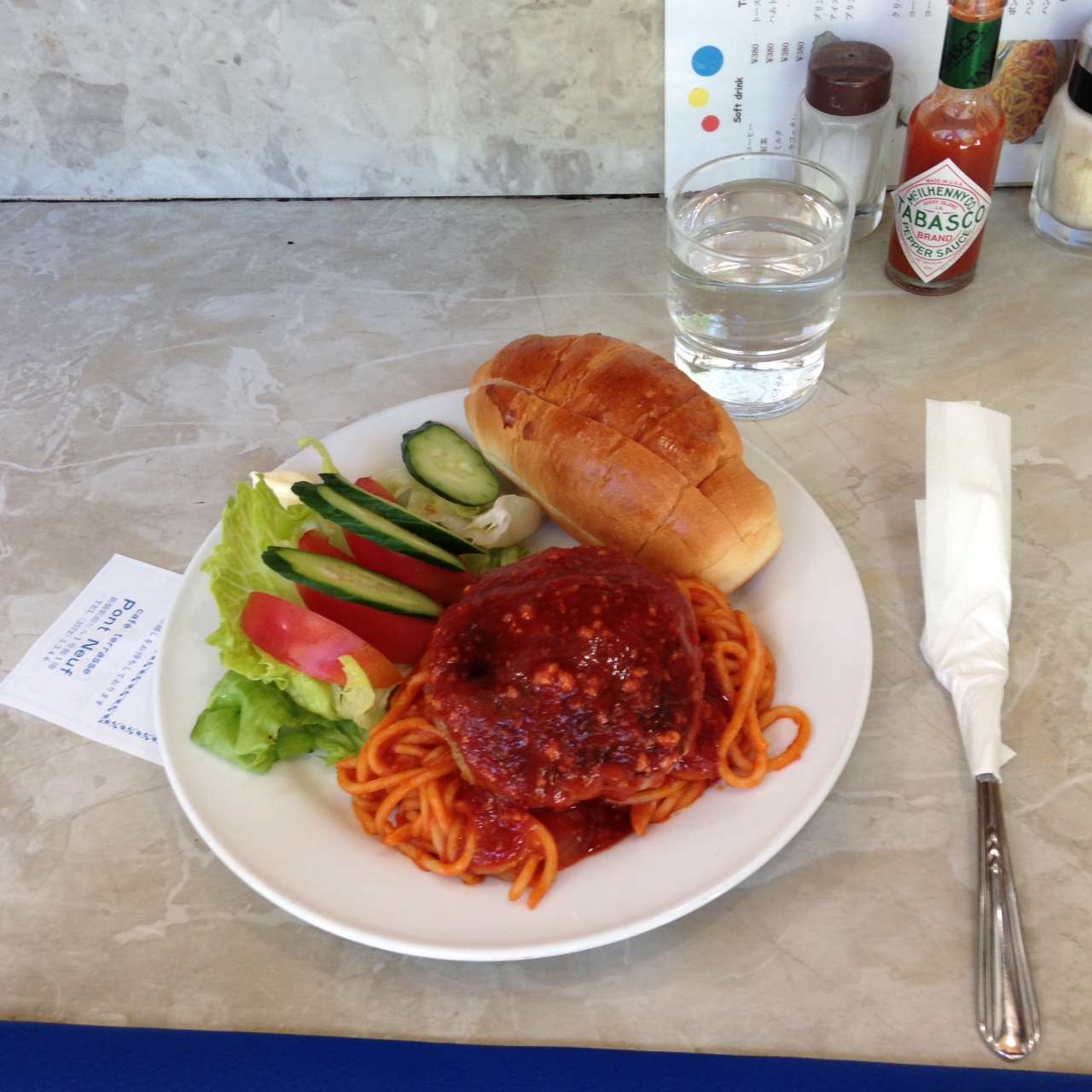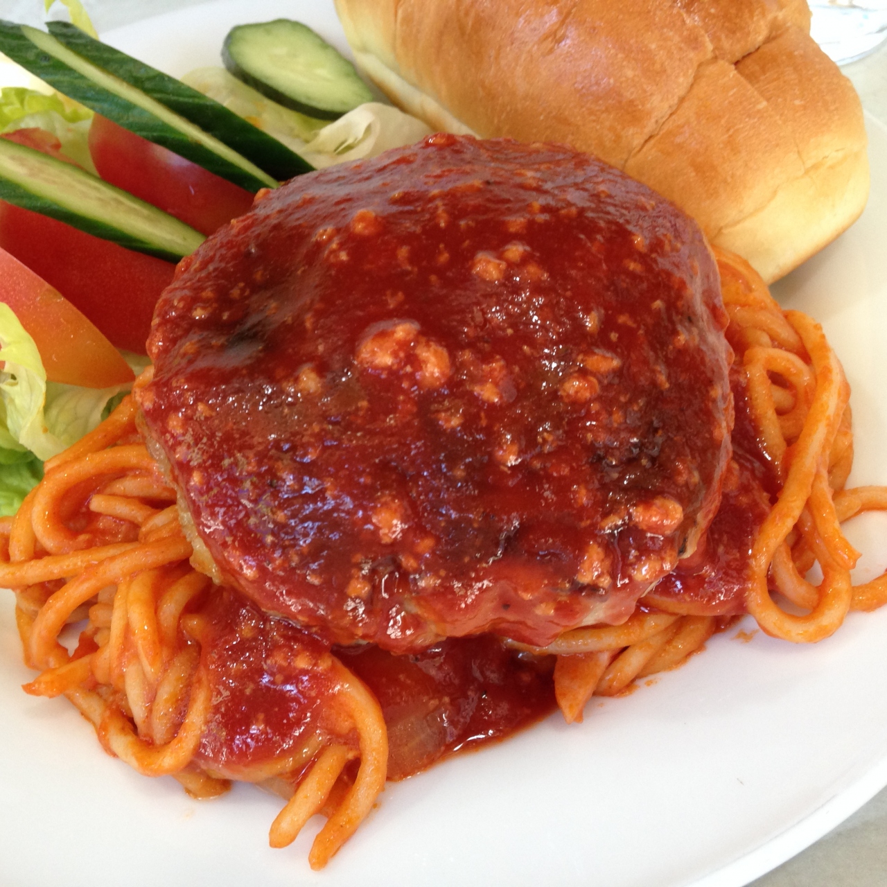 生野菜,スパゲティ,ハンバーグ,バターロール。
