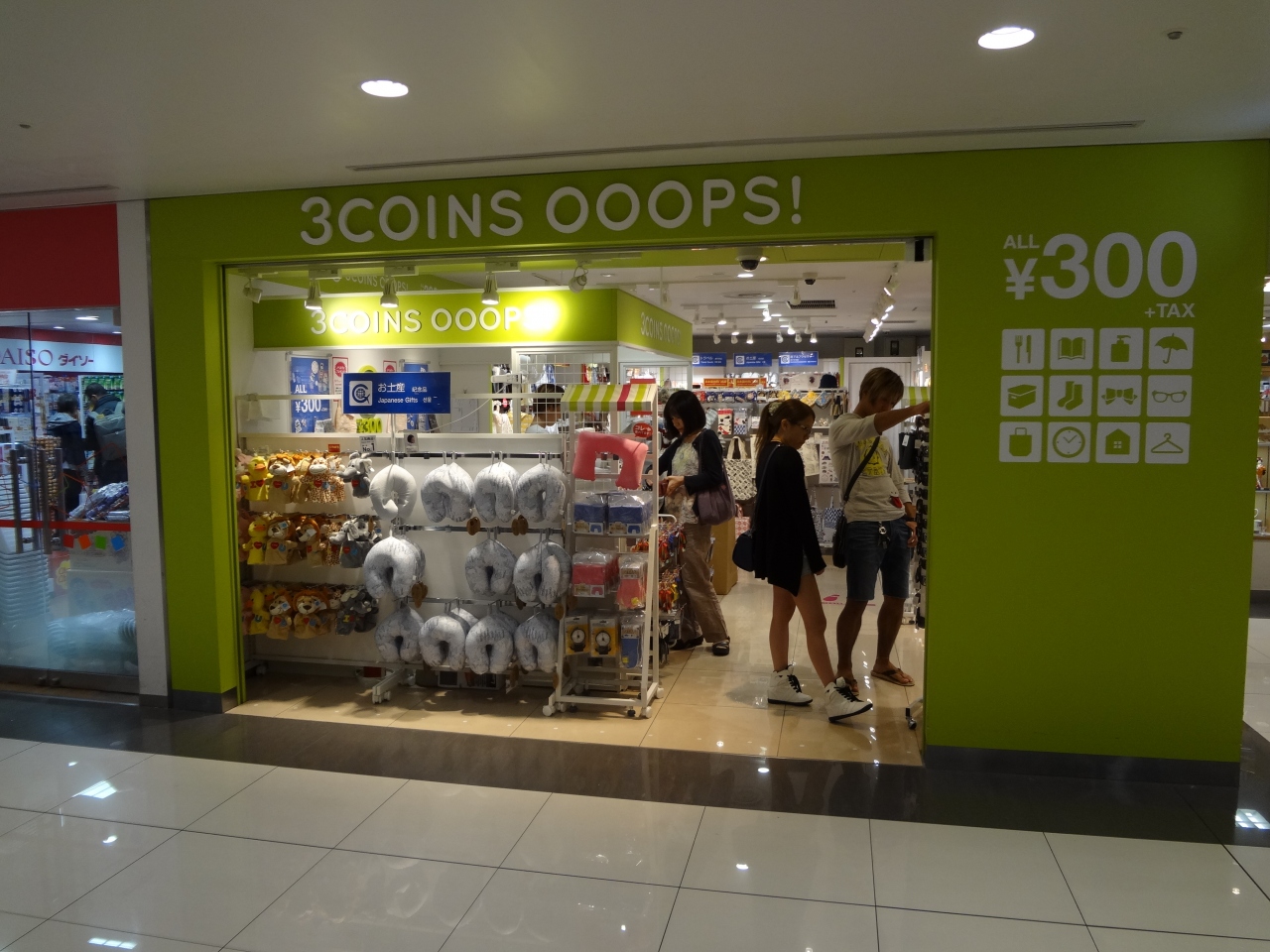 フライトまでの空き時間を利用し、ターミナルビルで買い物や食事をしましたが、3階には「3COINS」と「ダイソー」が隣り合っていました。