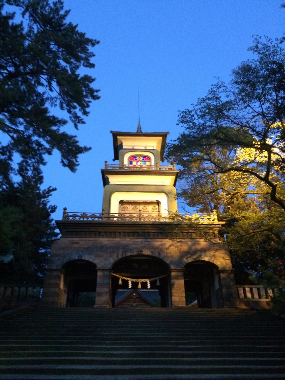 夜はライトアップされていて、とてもきれいでした。きれいなだけではなく、前田利家とまつが奉ってある由緒正しい神社です。