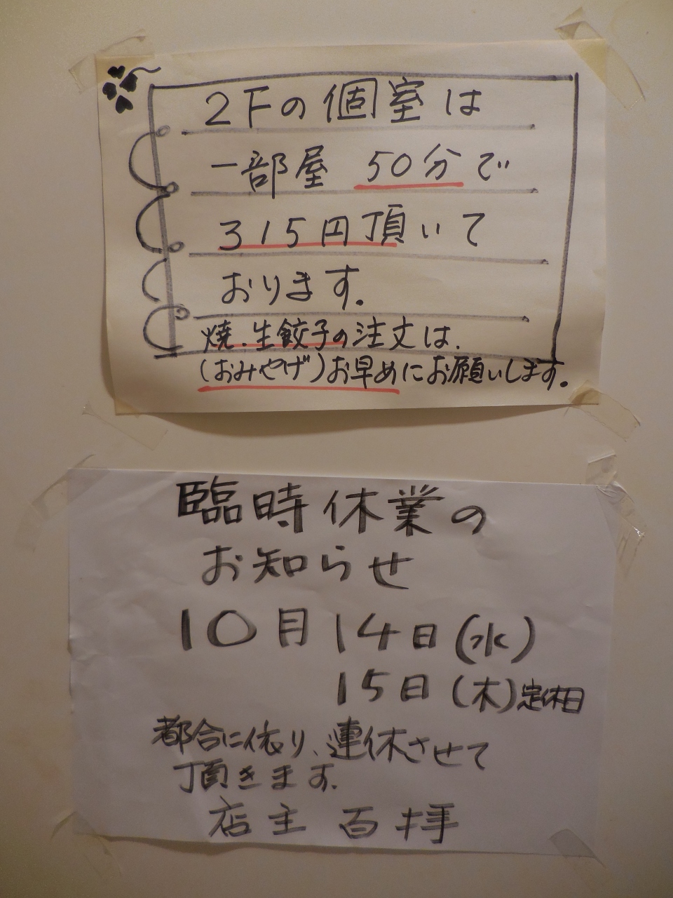 このお店には2階にも客席があるのですが、一度も案内されたことがなかったので不思議に思っていました。今回最後の客になって、閉店時間を過ぎて外で列んでいました。お店の人が出て来て、まだ一階の客席が空くのにかなり時間がかかるということで、初めて二階に案内されました。二階には7つの仕切られた座敷の部屋があり、「一部屋50分で315円頂きます」と書かれていました。案内された時は、他に2部屋が使用中で、話しが盛り上がっているようでした。皆様も特別な会合等の場合は利用されたらいいと思います。当然ですが今回は無料で部屋を利用できました。