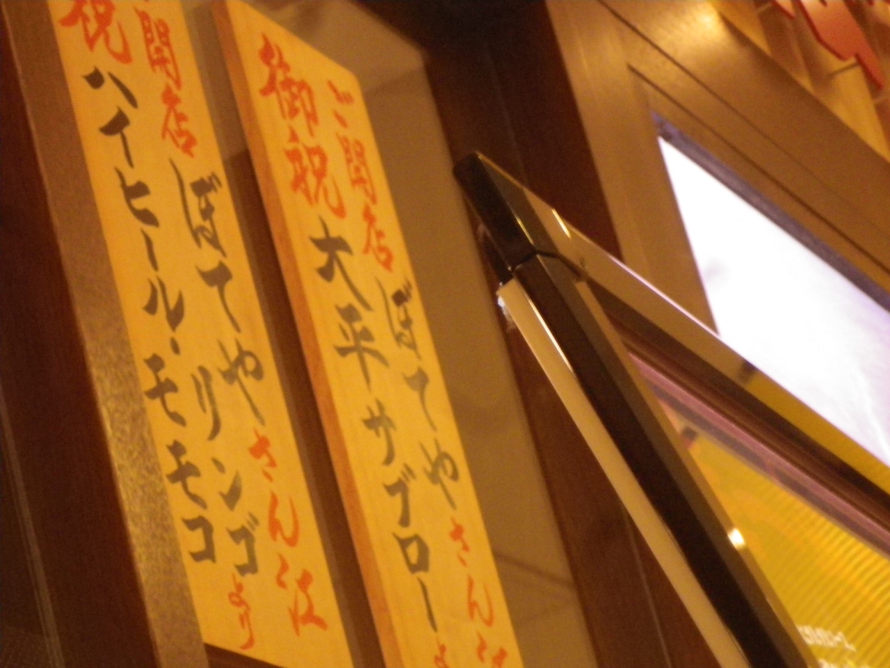 地下街のレストラン街が充実しています。大阪のお好み焼き店で有名なぼてじゅうが、ぼてやという名前で新規開店しており、その開店祝いの表示に目を奪われてしまいました。太平サブローや、ハイヒールモモコはわからないでもないですが、チェジウにチャンドンゴンって・・・