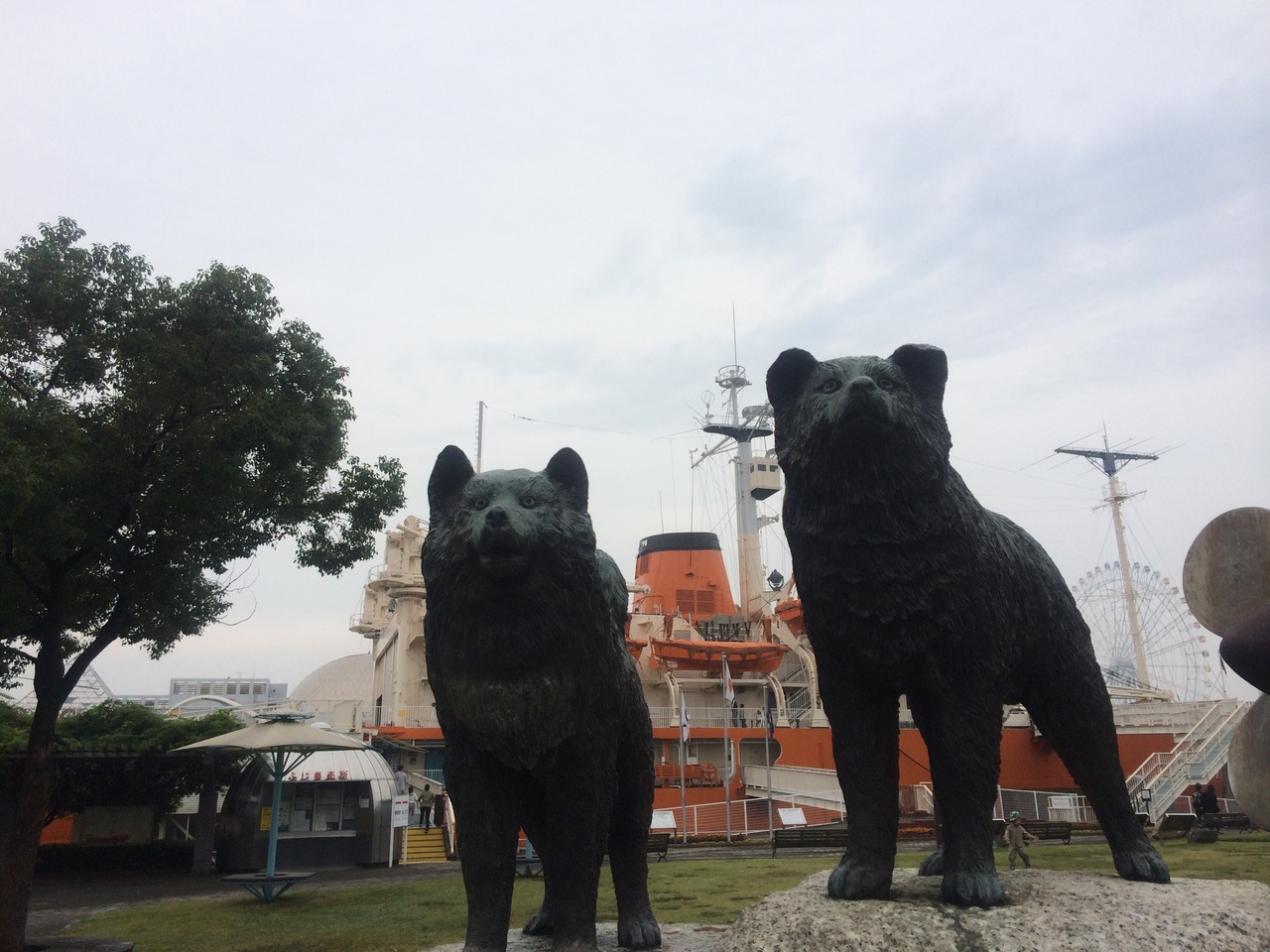 地下鉄名古屋港駅から徒歩数分で南極観測船のある広場にでます。広場にはタロとジロの銅像、南極で使用していた雪上車も展示してあります。観測船の中の見学も可能ですが、今回は行きませんでした。中は狭い空間を快適にする工夫があり感心します。1度入って見ると観測隊の御苦労が、わかります。