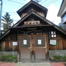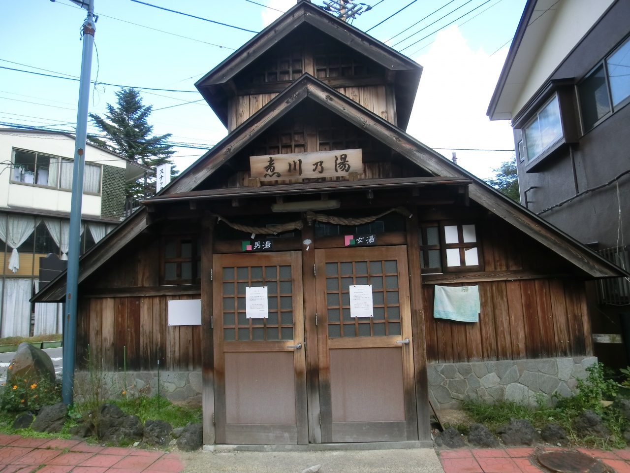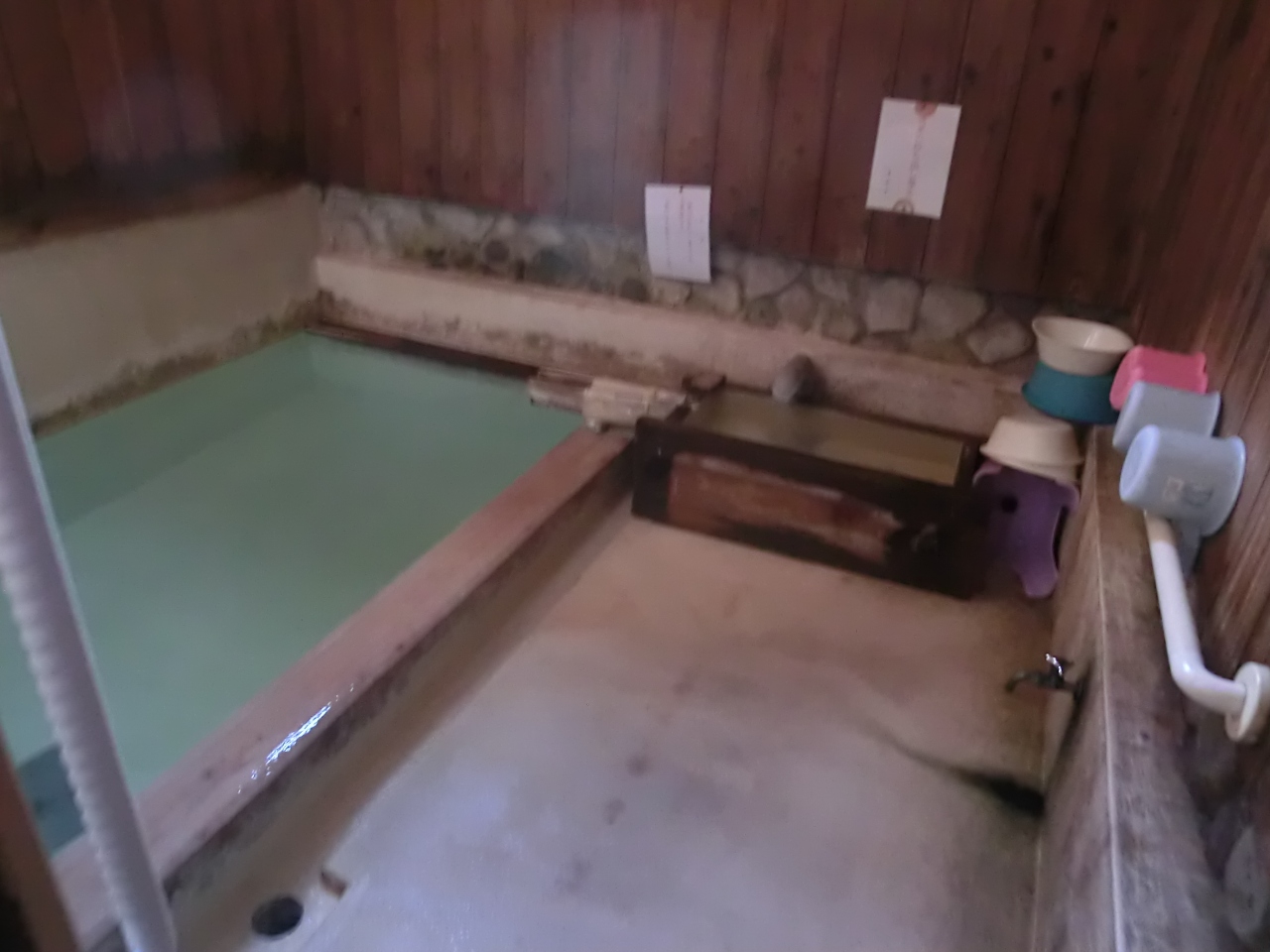 湯畑からは千代の湯を通り過ぎて、大滝のすぐそばにあります。熱いと聞いていましたが、それほどでもなく入ることができました。貴重品を入れるビニール袋が下げてあり、これに入れて湯殿内に吊しておくことができます。だれもいませんでした。