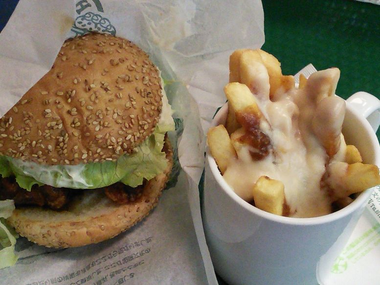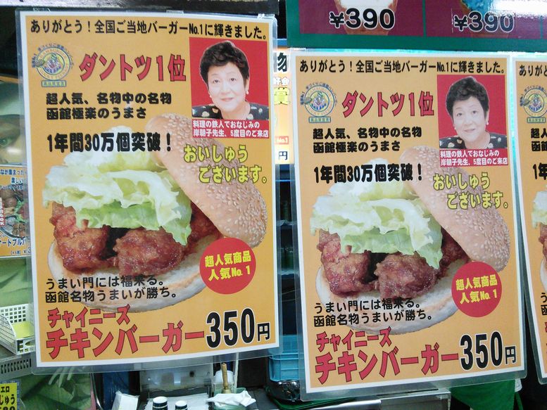 函館に行ったら必ず食べるべし、とガイドブックにあったので、行ってきました。本当はベイエリア本店に行きたかったのだけど、日中街中を歩いて疲れていたので、最も歩かなくて済む凾館駅前店に行きました。8月最後の日曜日の午後8時頃に行ったら、店には客が一人もおらず、がらんとして淋しい雰囲気でした。この店の一押しである、チャイニーズチキンバーガーとダントツ人気メニューだというラキポテとウーロン茶のセット(No.1セット850円)を注文しました。ラキポテとは太めのフレンチフライにデミソースとホワイトソースとチーズをかけたものがモーニングカップに入っています。他に客がいなかったのですが、注文後番号札をもらい、テーブルについて待っていると商品が運ばれてきました。料理は素材や調理も大切ですが、一番簡単にでき、それでいて最も大切なことと私が思っているのは、適温で提供することです。熱いものは熱く、冷たいものは冷たく出すことです。しかし、チャイニーズチキンバーガーは出来上がりを待っていたにも関わらず、中途半端な温かさ。これが適温なのでしょうか?私には適当に作って適当に出したとしか思えません。勿論、美味しく頂けるはずもありません。ポテトもぬるくて不味い。つまり、熱いものは熱く出すという最低限のルールが守られていない店でした。後で追加注文したオニオンリングフライと春巻きはアツアツで美味しく頂きました。店には岸朝子先生の顔写真入りでこのバーガーが「おいしゅうございます」と