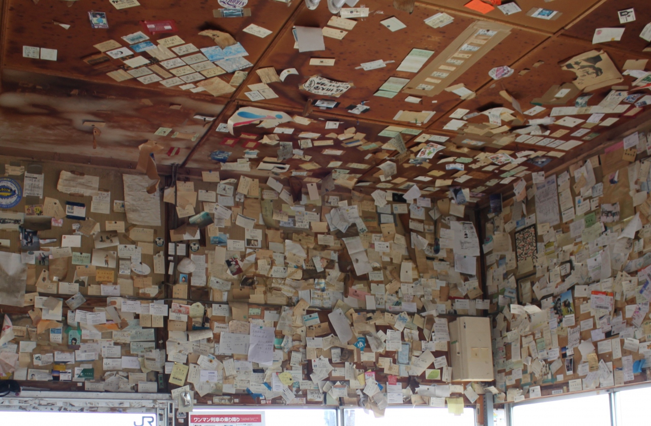 待合室の壁面を埋め尽くす名刺や切符がこの駅の風物詩、駅舎内にレトロな喫茶店があるのもいいですね。