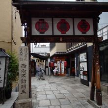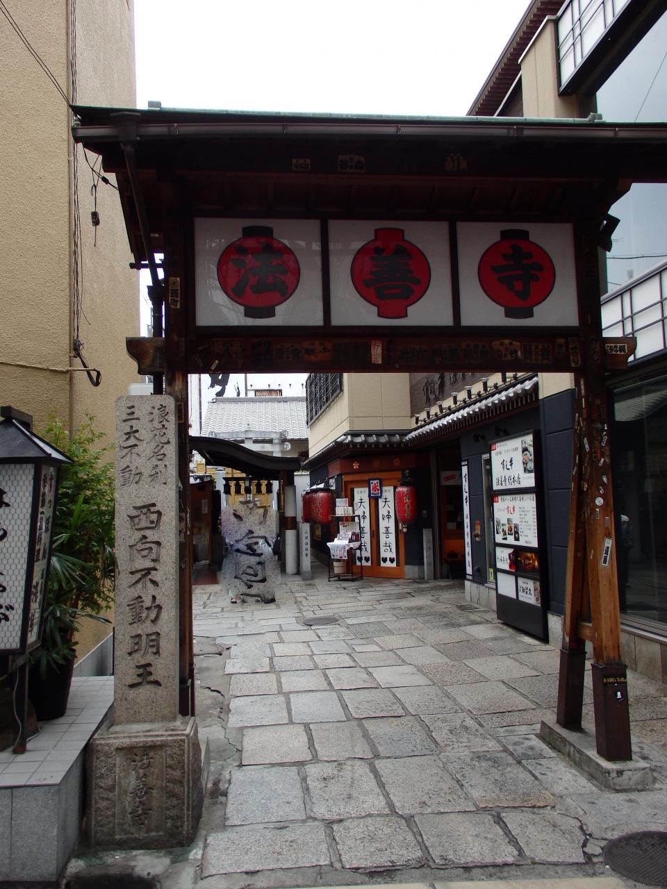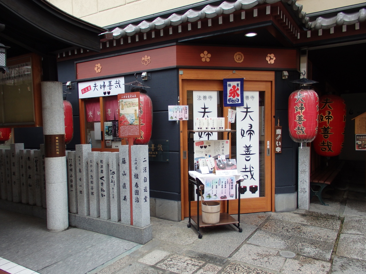 難波のにぎやかな大通りをちょっと横に折れると、小道がいくつかあります。その中の一つが法善寺横丁。3つの提灯に一字ずつ法・善・寺と書いたイラストの門をくぐると、石畳の道が続いています。両側には古いお店があり、しばらく歩くと水掛不動尊で有名な法善寺があります。