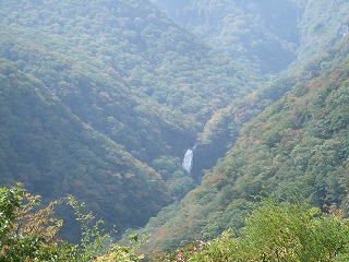 左手に見える三階の滝は高さ181m、幅7mもあります。3段階に水が落ちて、滝壺が3つあることから三階の滝と命名されて、日本の滝100選に選ばれています。
