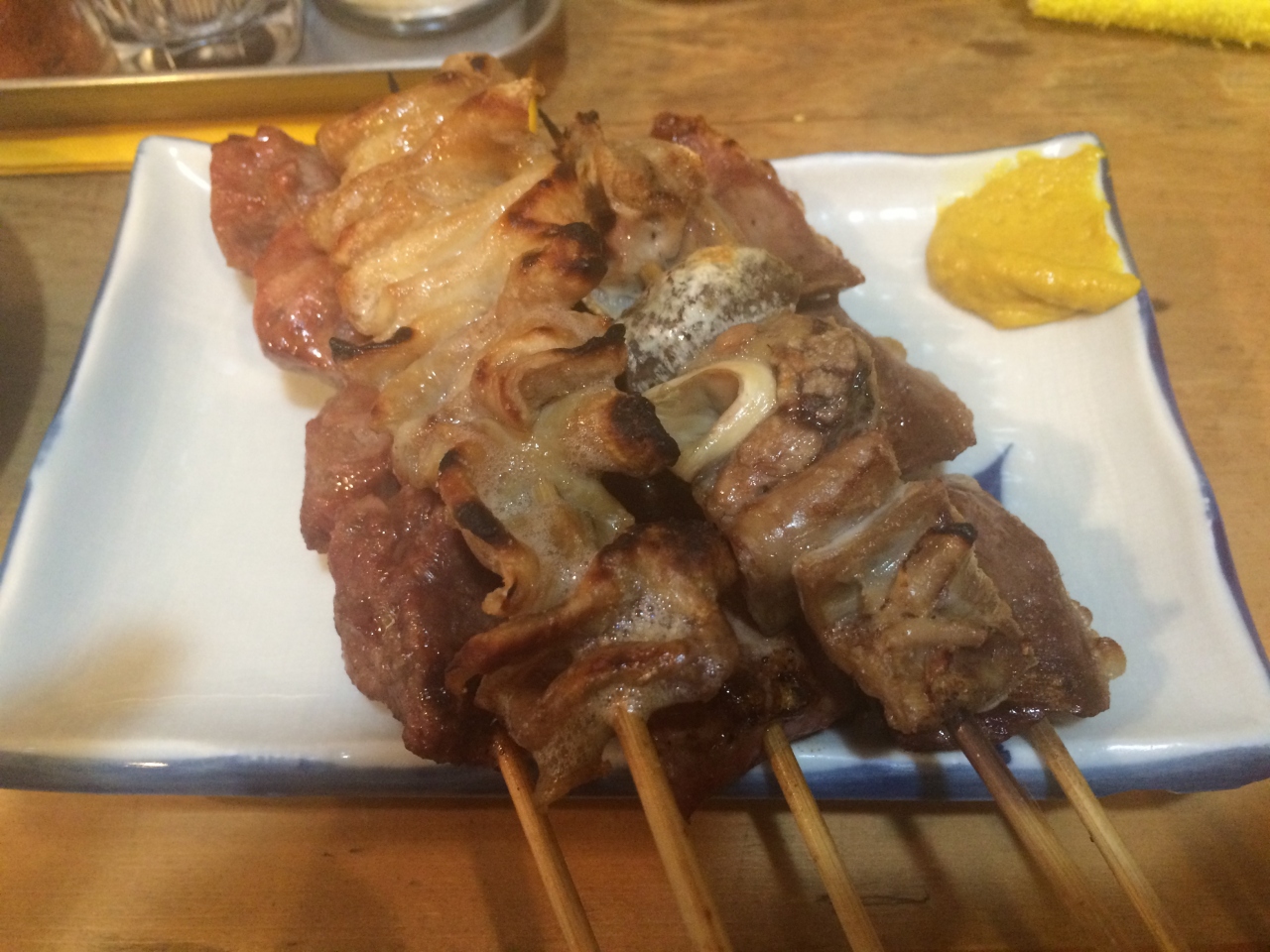 やきとりの盛り合わせももらいました。カウンターで友人と並び、背中を丸めて飲みます。演歌が流れています。良い雰囲気ですね。ダメ人間の最終駅という感じがします。
