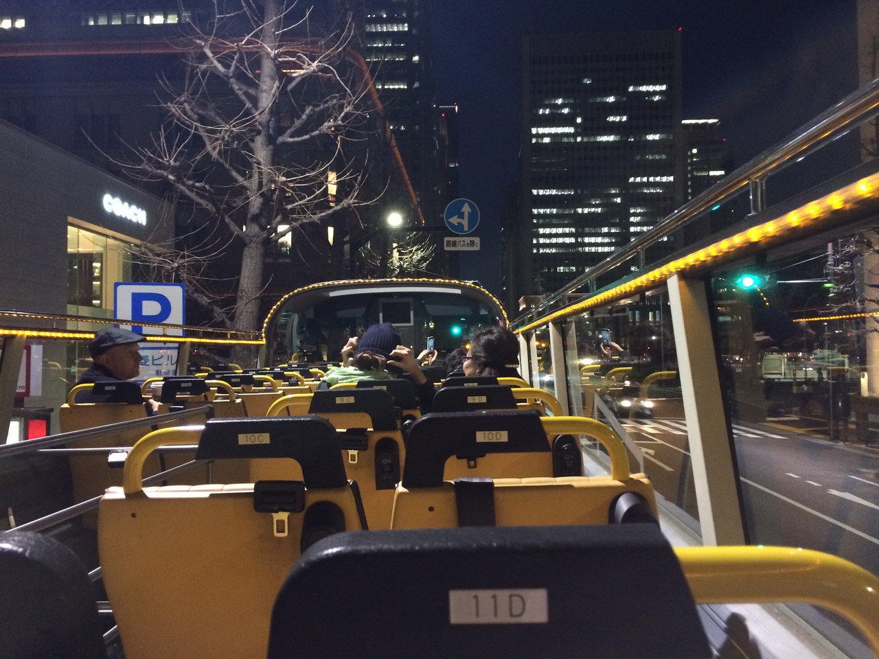 3月中旬に参加。バスに乗ると掛け物とカイロを配ってくれました。オープンバスで東京タワーの真下を通り、レインボーブリッジを渡ってお台場へ行って帰ってくるというコースです。ライトアップされたタワーや景色はとても綺麗で満足ですが、とにかく寒い!寒がりの私は急遽フリースを購入して乗りましたが寒かった‼寒さ以外は楽しいし、大満足でした。何度も東京へは行っているという方にもオススメしたいです。