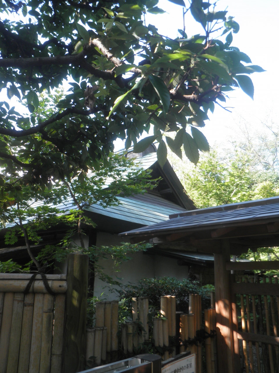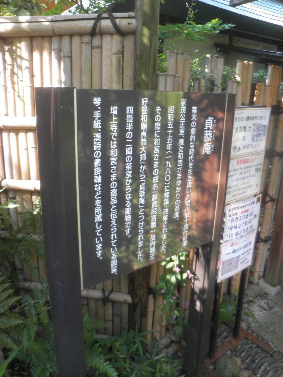 増上寺の境内にある皇女和宮ゆかりの茶室なのですが、おとずれたときは竹垣に囲われて、門も閉ざされているため、内部を見学することはできませんでした。場所は増上寺の本殿の裏手の奥で、周囲には小高いところに納骨堂などがありました。