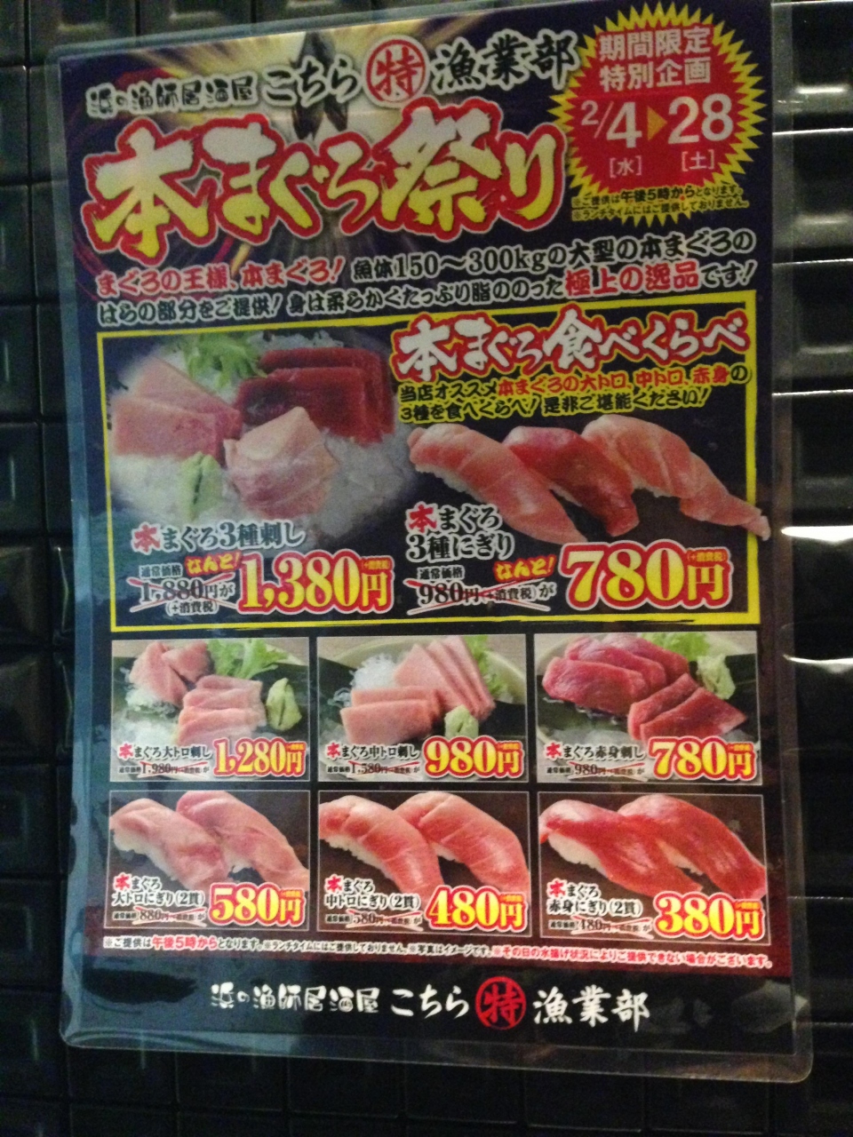 近海で水揚げされた新鮮な魚介類をどこよりも安く提供してくれる居酒屋さんで、2月は本まぐろ祭りを開催していました。