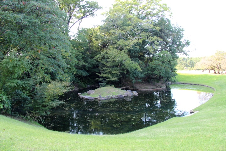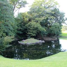 岡山後楽園内の東隅にある小さな池です。小さな花交の滝がアクセントになっています。園内を巡ってきた曲水の水はこの池から旭川に戻って行きます。周りに竹林などがあって園内の中では訪れる方があまりいなく静かなところです。