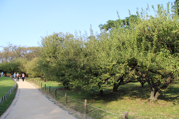 岡山後楽園の東側の端に、千入の森(もみじ)、桜林の先に梅林がありました。それ程広い空間ではありませんが、100本もの梅が植えられているそうです。梅の花が咲く頃は良い香りがしそうです。秋口なのでそのような楽しみがなく残念です。