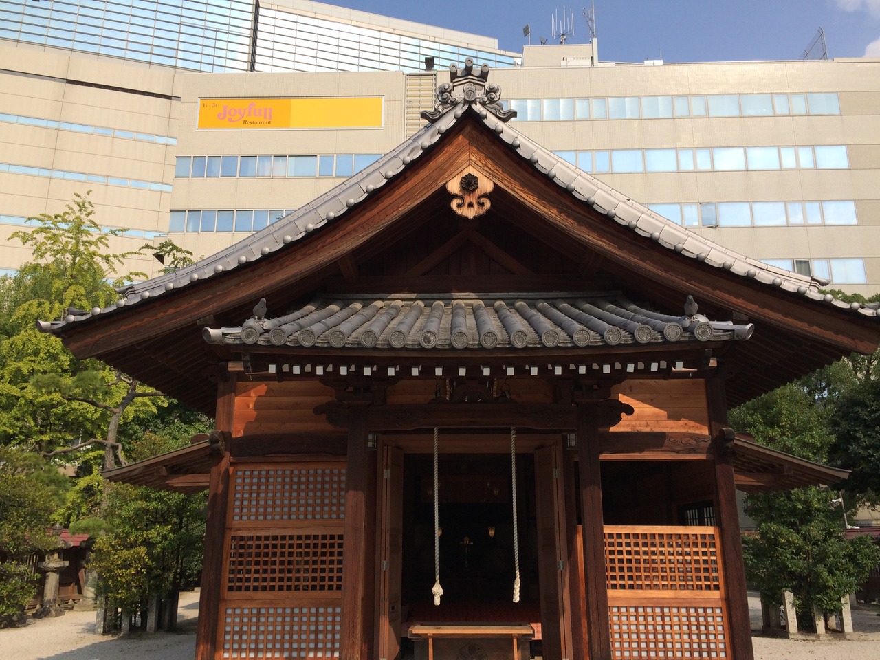 九州随一の繁華街の中にある神社です。現在の場所に、約400年前に黒田長政が、建立した歴史ある神社です。天神バスターミナルがある西鉄福岡駅ビルのすぐ西側にあり、北側の警固公園とともに周囲をビルに囲まれています。ここには大きな樹木もあり周囲の喧騒を離れて静かな空間が残っています。
