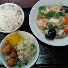 最初にスープが来て、後から八宝菜とご飯、唐揚げが来ました。
