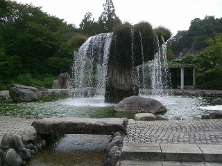 材木岩が良く見える場所に材木岩公園が整備されていて、ユニークな噴水や水路があって、落ちつける雰囲気の公園です。