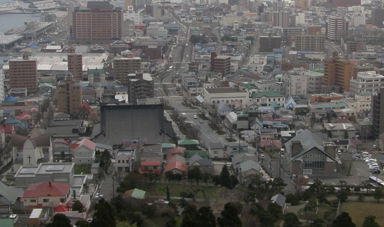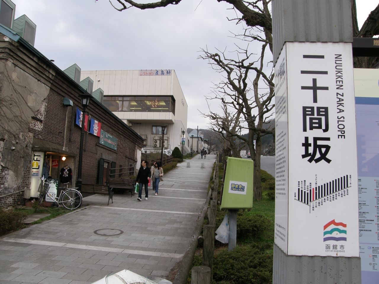 二十間坂は、その名の通り、幅が二十間あることが由来だそうです。昔から火災の多かった函館で、その延焼を防ぐための防火対策として、道を港に真直ぐに引き、そして道幅を大きくしたとか。