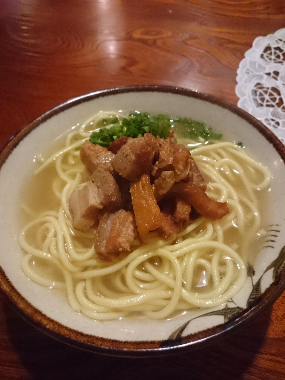 そばは普通の量、多くも少なくもなく。おでんはてびちがはいっていて、これはボリュームがあって、お腹一杯になりました。