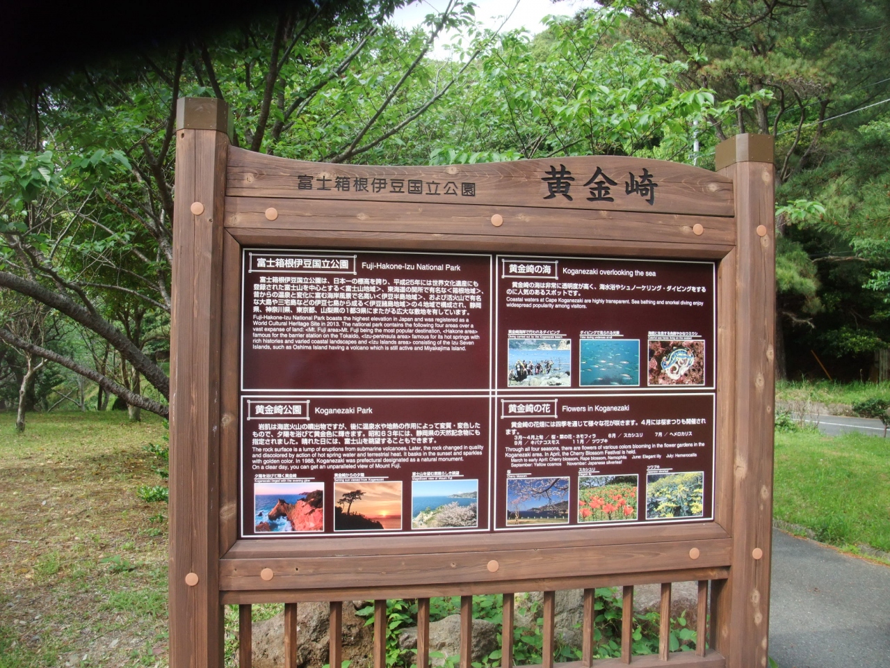 この岩肌は、夕日を浴びると黄金色に輝きます。黄金崎は、昭和63年に静岡県の天然記念物に指定されています。