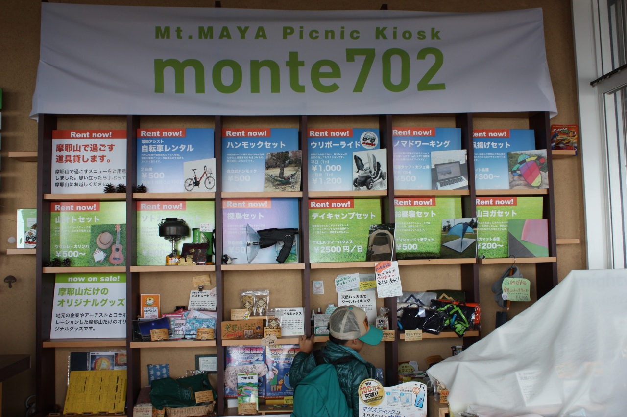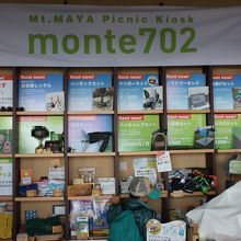 お店の中はブックコーナー、ショップも併設。まや山オリジナルグッズ(バッジや手ぬぐいや)販売とバーナーなハンモック、自転車のレンタルなどもあります。