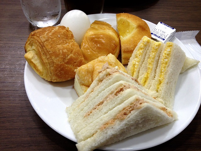 モーニングは490円で、ワンドリンクとゆで卵&パンが食べ放題のシステムです。パンは店売りのものと既製品のものが半々で10種類くらいありました。サンドイッチが一番おいしかったです。(これはお店でちゃんと作っていると思います。)まあ絶対おススメというわけではないけど、このお値段ならそこそこイケてるモーニングだと思います。