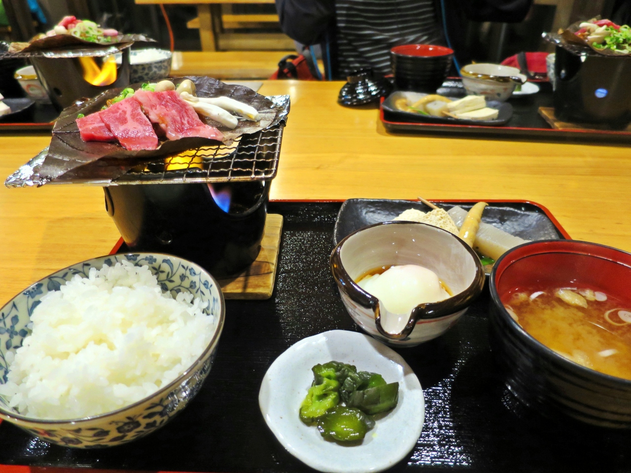 - 飛騨牛の朴葉(ほうば)焼き定食が1350円