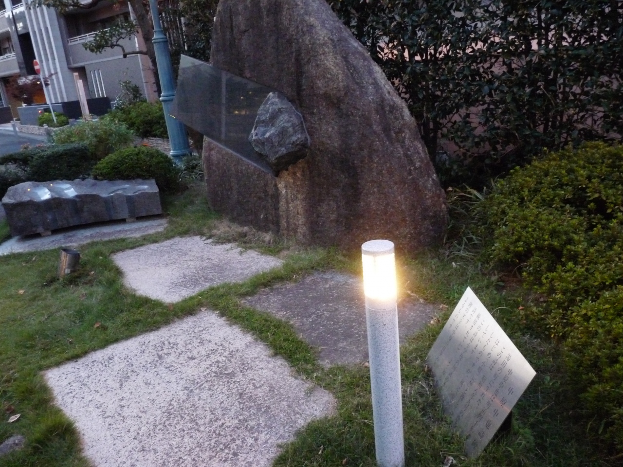 山口県の有名な温泉地の湯田温泉。温泉街には欠かせない夜の散歩で見つけた中原中也氏の詩碑でした。微妙な照明によるコントラストが美しく,観光旅行で訪問した甲斐があったと言える風情ある詩碑です。メイン道路から1本入った道路に面していますが交通量もほどほどで,ほろ酔い気分で楽しい散歩ができました。