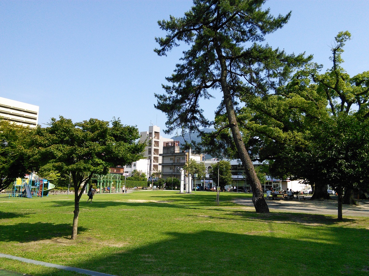 別府の住宅街にある開けた公園です。芝生が広がっていてあんまり木とかははえていないので日差しが照りつけて暑いです。