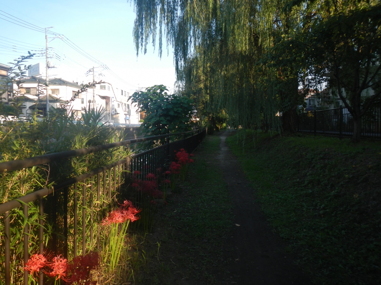 このあたりは元荒川が流れていて、それに沿った形で葛西用水があり、それが谷古田用水、八条用水とに分かれる。かつての水郷越谷と呼ばれていたころの面影が少し残っている。その用水に沿って緑道が整備されている。9月下旬ということもああい、彼岸花が咲いていたのが印象的だった。