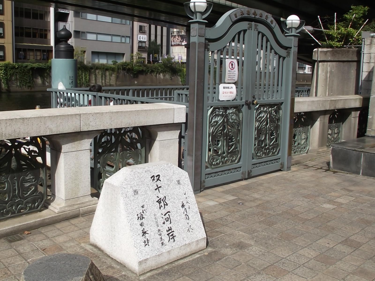 石段を下りた右手に滝があり、左手には 双十郎河岸 と言う背の低い石碑があります。