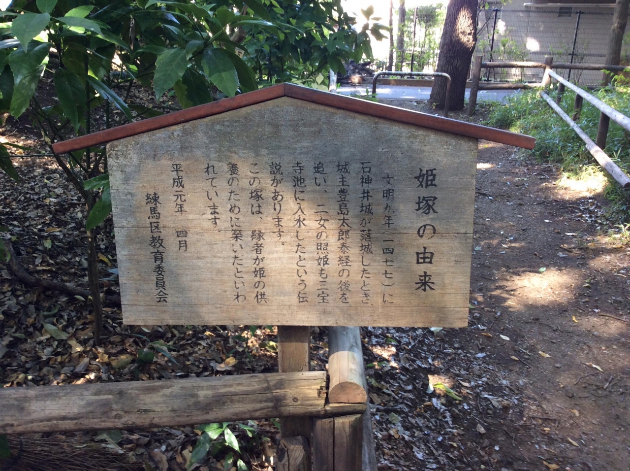 石神井公園駅から徒歩25分くらいでしょうか。公園内の三宝寺池の北側にあります。泰経には照姫という美しい二女がいた。照姫は父の死を悲しみ、父を追って三宝寺池に身を投げた。文武の名将道灌がこれを憐れみ、照姫の亡骸を弔って塚を築いた。この塚はいつしか姫塚と呼ばれ、そのそばに立つ老松は照日の松と呼ばれている。実際は違うそうですが。
