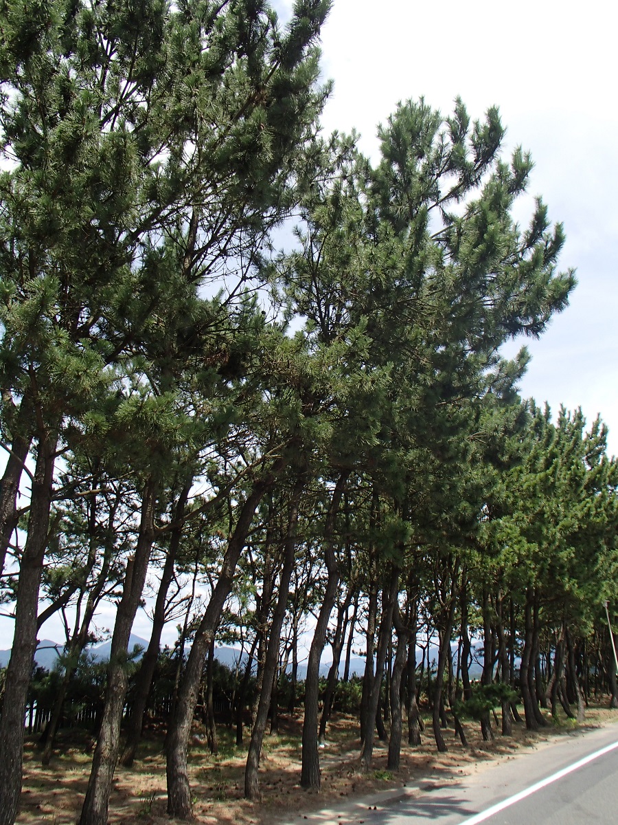 唐津の海岸沿いに弓のように湾曲して伸びる白い砂浜と黒松の林です。