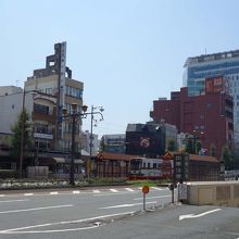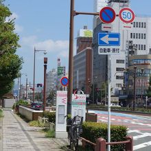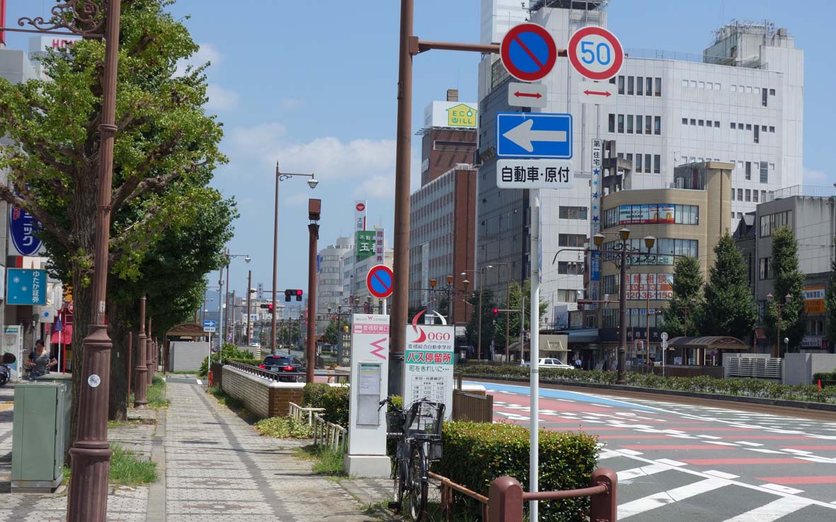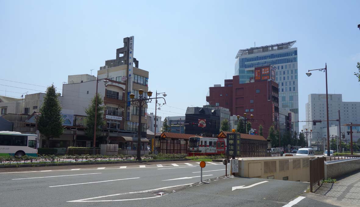豊橋駅前から斜めに伸びる大通りです。市内の主要な施設を結んでいる豊橋鉄道東田本線(ほぼ路面電車)が走っていて生活の要となっているようです。沿線には百貨店、あのキューリのキューちゃんで有名な東海漬物の本社もあります。