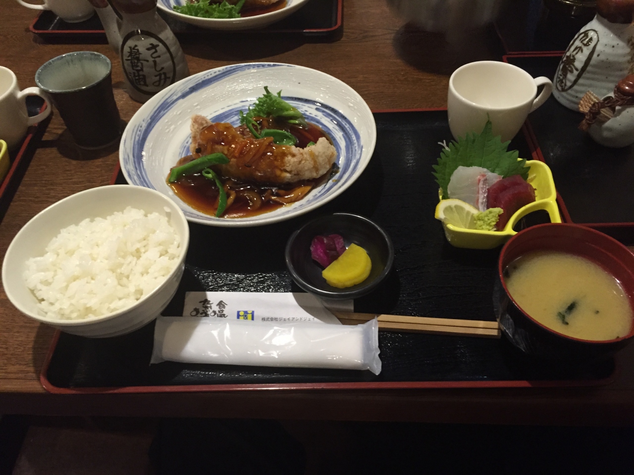 店頭に本日の日替わりのコース紹介があり美味しそうだったので日替わり定食を食しました。甘酢醤油かけの白身フライ、とても美味しかったです。(2015/10/16)