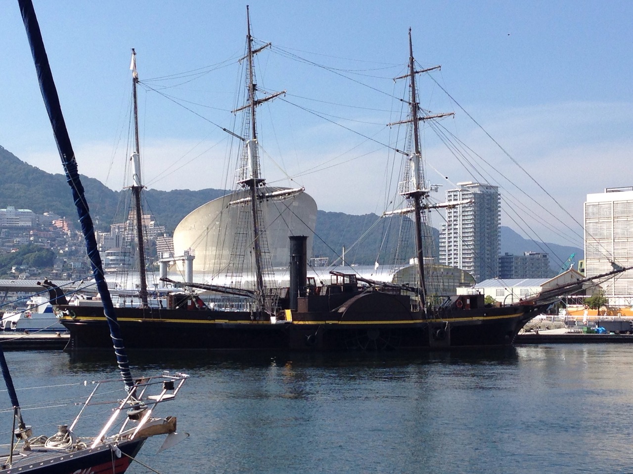 稲佐山観光を終え、次に向かったのは、出島周辺のスポットです。レンタカーを駐車場に止め、散策をしました。長崎らしく黒船が係留されてなかなか雰囲気の良い場所でした。日曜日の午後だったためか、あまり観光客は居なかったのでのんびりと過ごす事が出来ました。