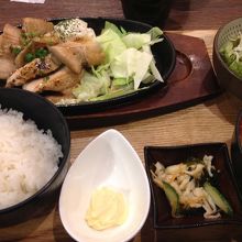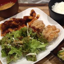 華味鶏の唐揚げとチキンカツ、もも焼き定食を注文。御飯と味噌汁はお代わりができます。